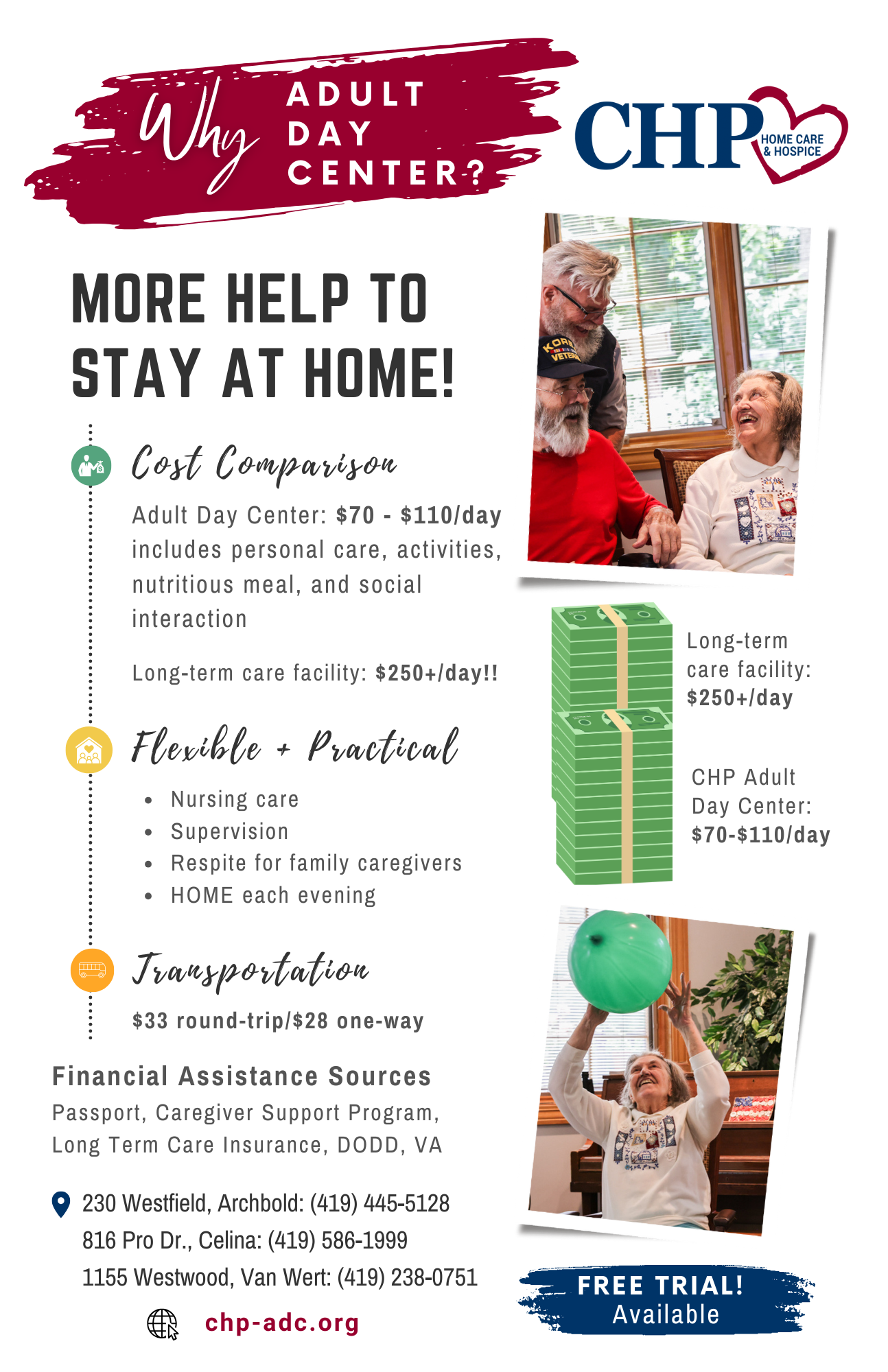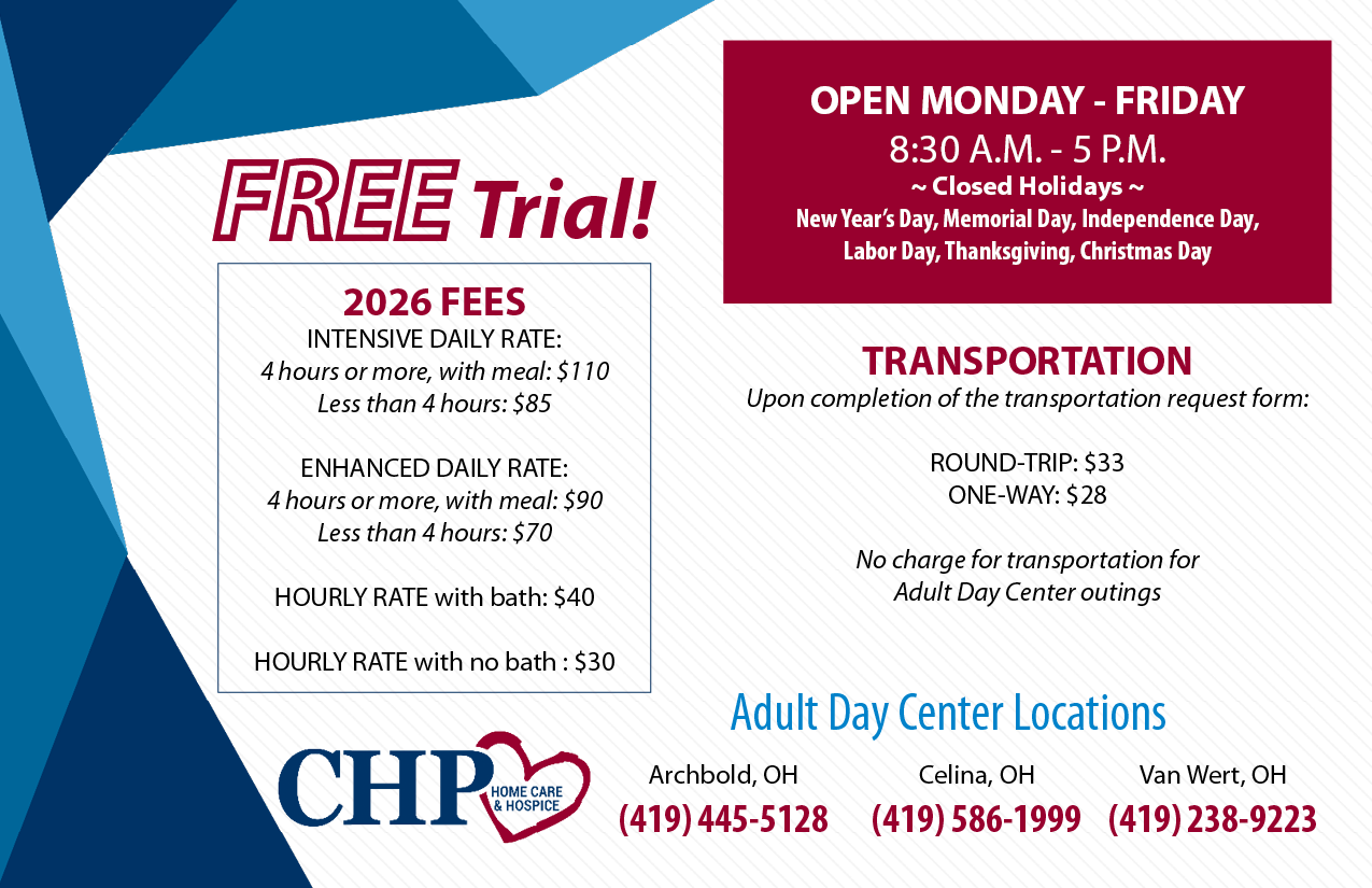 Our Adult Day Centers in Archbold, Celina and Van Wert provide a safe, socially-engaging and home-like environment. It’s a place where loved ones can develop friendships, be active and social, and do the things they enjoy!